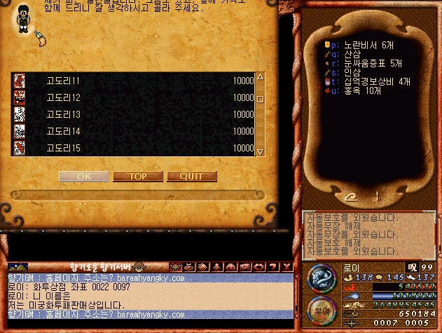 바람의나라 내에서 고도리 아이템들로