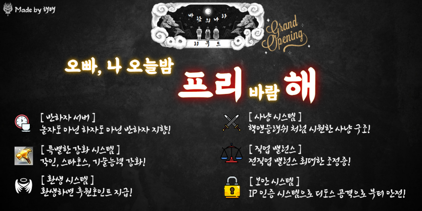 ✅ 바람의나라 리부트 ✅ 레이드 ✅ 미궁,황제암살,반고의화신,진귀문마동,시탑,무탑 ✅ 인던,레이드 완비 ✅