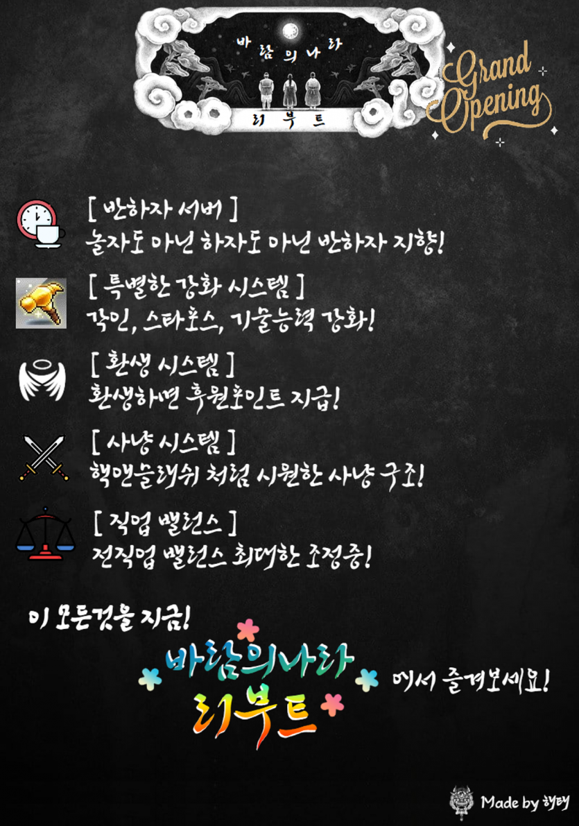 ✅ 바람의나라 리부트 ✅ 레이드 ✅ 미궁,황제암살,반고의화신,진귀문마동,시탑,무탑 ✅ 인던,레이드 완비 ✅