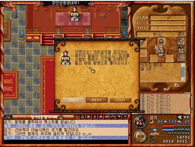 왕을 클릭해서 퀘스트를 받습니다, 하지만 선비검객이나 선비평민을 잡아오라는 명을 받으면 됩니다.