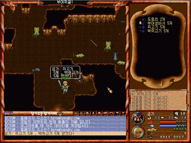 흑선목봉으로 열심히 박쥐와 쥐들을 두들겨패서 쥐고기5개와 박쥐고기 5개를 얻었습니다.사실 저는 이 도우미 시스템이 정말 잘되어 있다고 생각합니다.2편에도 나오겠지만 단순하게 경험치만 팍 줘서 시시하게 레벨99를 만드는게 아니라, 부여성에 있는 모든 굴들을 체험할수 있도록 해주면서 유저들이 힘들지 않도록 소량의 재료만 구해서 퀘스트를 완료할수 있도록 정말 잘 구축했다고 생각합니다.